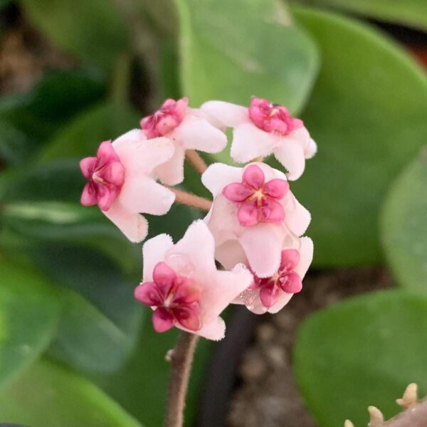 Hoya Obovata are native to tropical Eastern Asia and parts of Australia. Hoyas are desired for their waxy leaves and flowers. The leaves can grow up to 3” long. They can grow just about anywhere, if grown indoors place near a aerated location and keep humid. They grow best with moderate sunlight and misting every week or when hot outside and water every 2 weeks inside or mist if dry. They can grow to be as long as the object it climbs on.