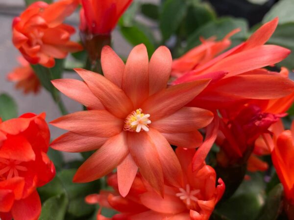 The Orange Easter cactus, known scientifically as Rhipsalidopsis rosea, is a bushy, epiphytic plant native to the tropical rainforests of southeastern Brazil. It features spineless, segmented stems that are initially red and turn green, and it produces fragrant, funnel-shaped orange flowers that bloom in spring.